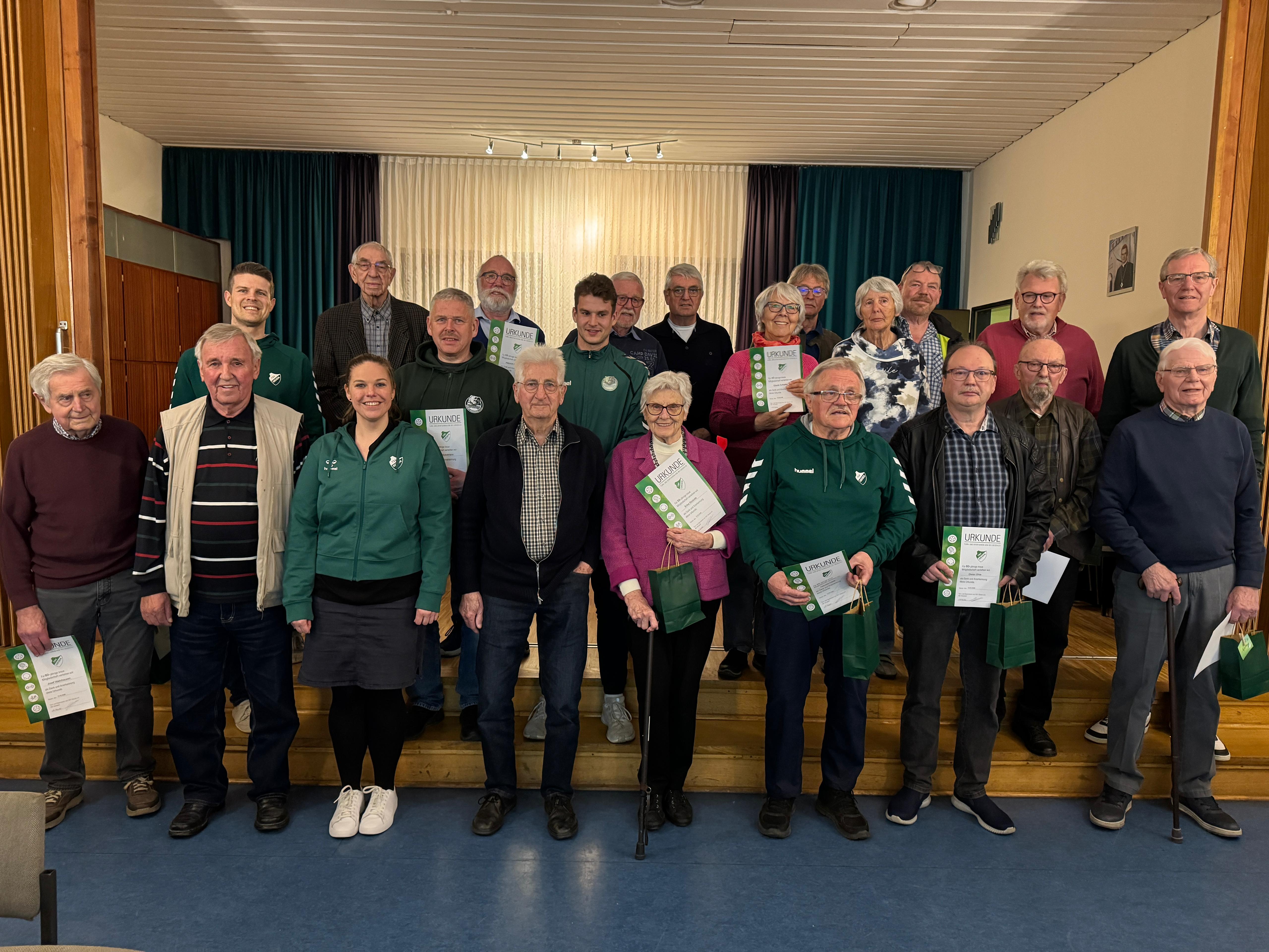 Traditionell wurden im Rahmen der Versammlung auch wieder langjährige Mitglieder für ihre Treue zum Verein geehrt. Fast 40 Personen waren hierzu im Vorfeld persönlich eingeladen worden, viele von ihnen folgten der Einladung. So konnten Ehrungen für 25, 40, 50, 60 und 65 Jahre Vereinszugehörigkeit vorgenommen werden. Besonders hervorzuheben sind dabei die Jubilare für 70 Jahre Mitgliedschaft – Johannes Eike, Gerhard Seidler und Johannes Seidler –, für 75 Jahre – Hubert Busche, Alois Rössig und Helmut Stolze – sowie für beeindruckende 80 Jahre Vereinszugehörigkeit – Herbert Rössig und Josef Wahrhausen.